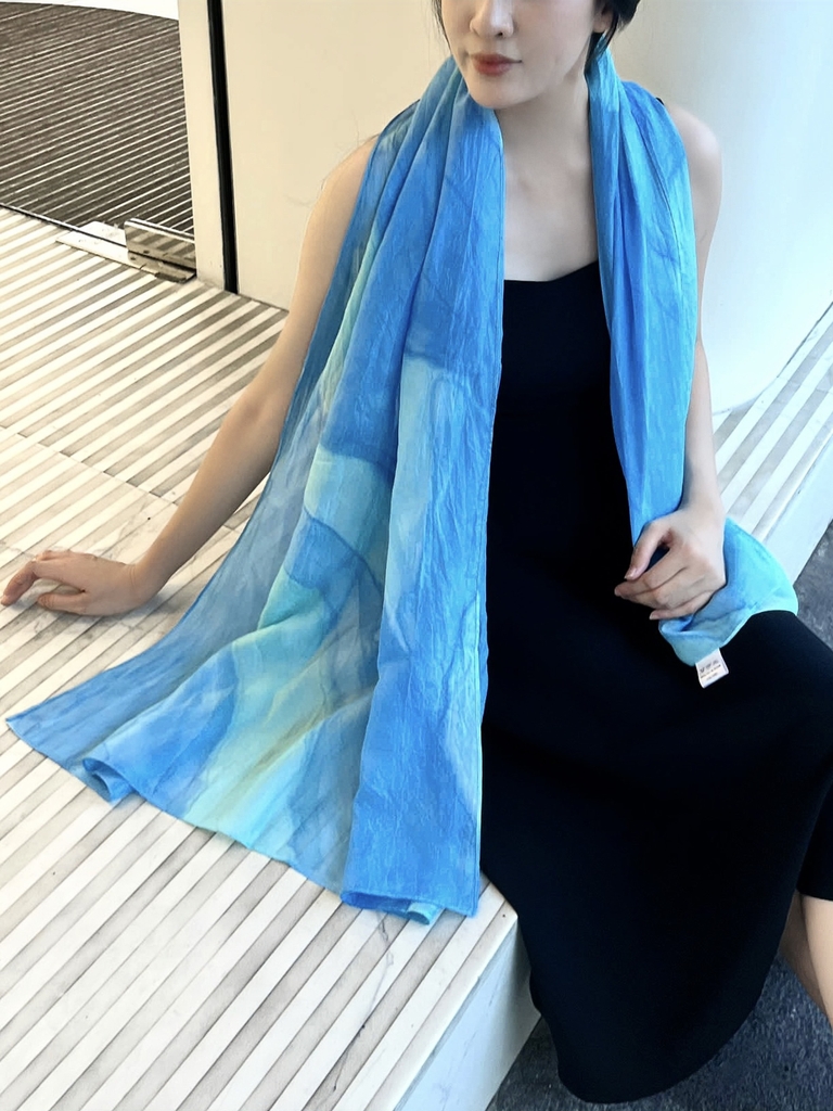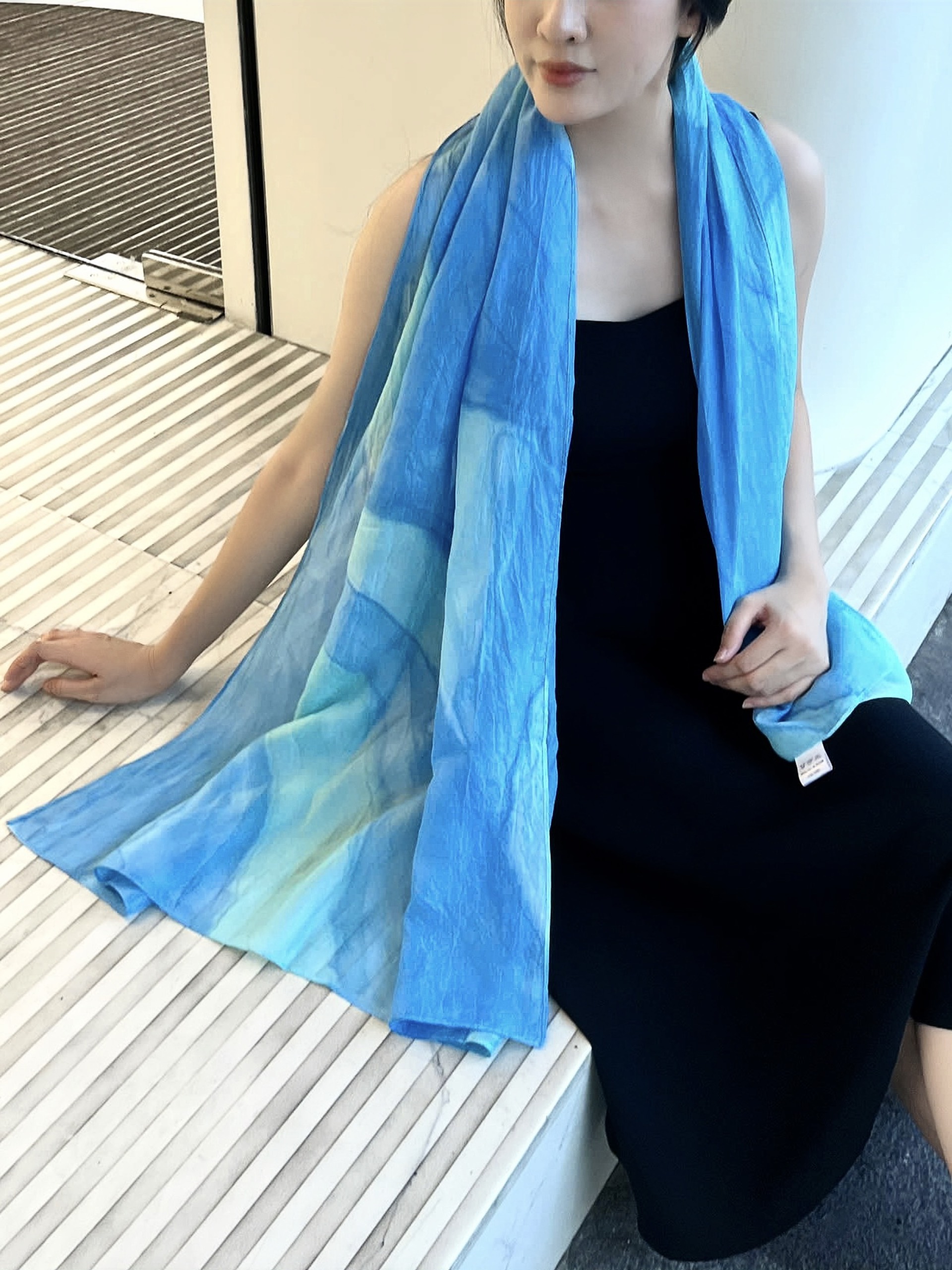·  Kỹ thuật: Kết hợp nhiều phương pháp thủ công: Ice Dye (tan chảy băng đá), Shibory (nhuộm buộc), và vẽ thủ công từng vệt màu trên khung vải.