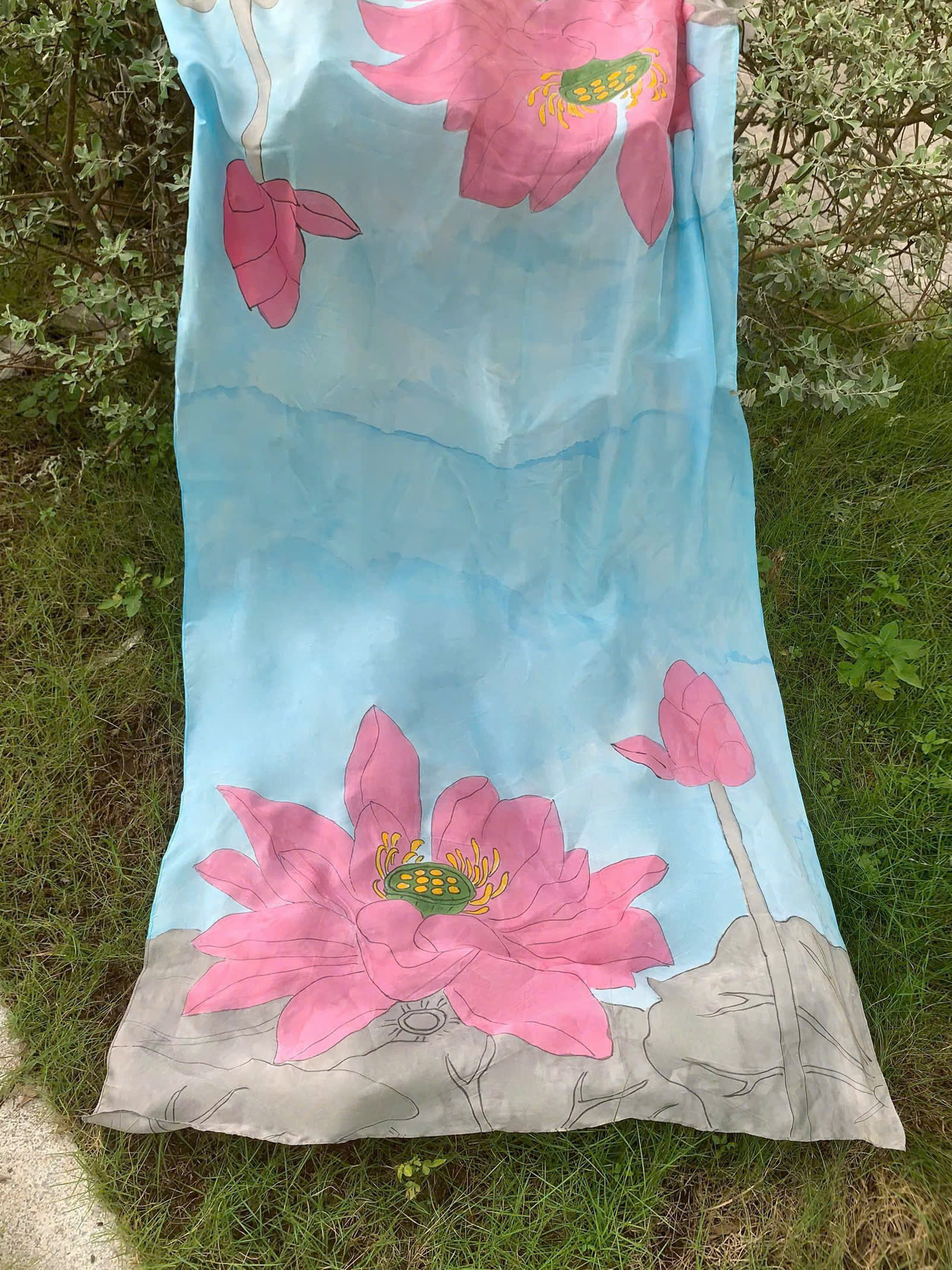 Từ những sợi lụa tơ tằm tự nhiên được dệt tinh xảo, nghệ nhân Kimcatsilk đã thổi hồn vào từng đường nét của hoa sen hồng – loài hoa biểu tượng của sự thanh khiết, niềm tin và vẻ đẹp tinh thần Việt. Trên nền xanh dịu mát, cánh hoa sen hồng rực rỡ càng tôn thêm vẻ sang trọng và hiện đại cho sản phẩm.