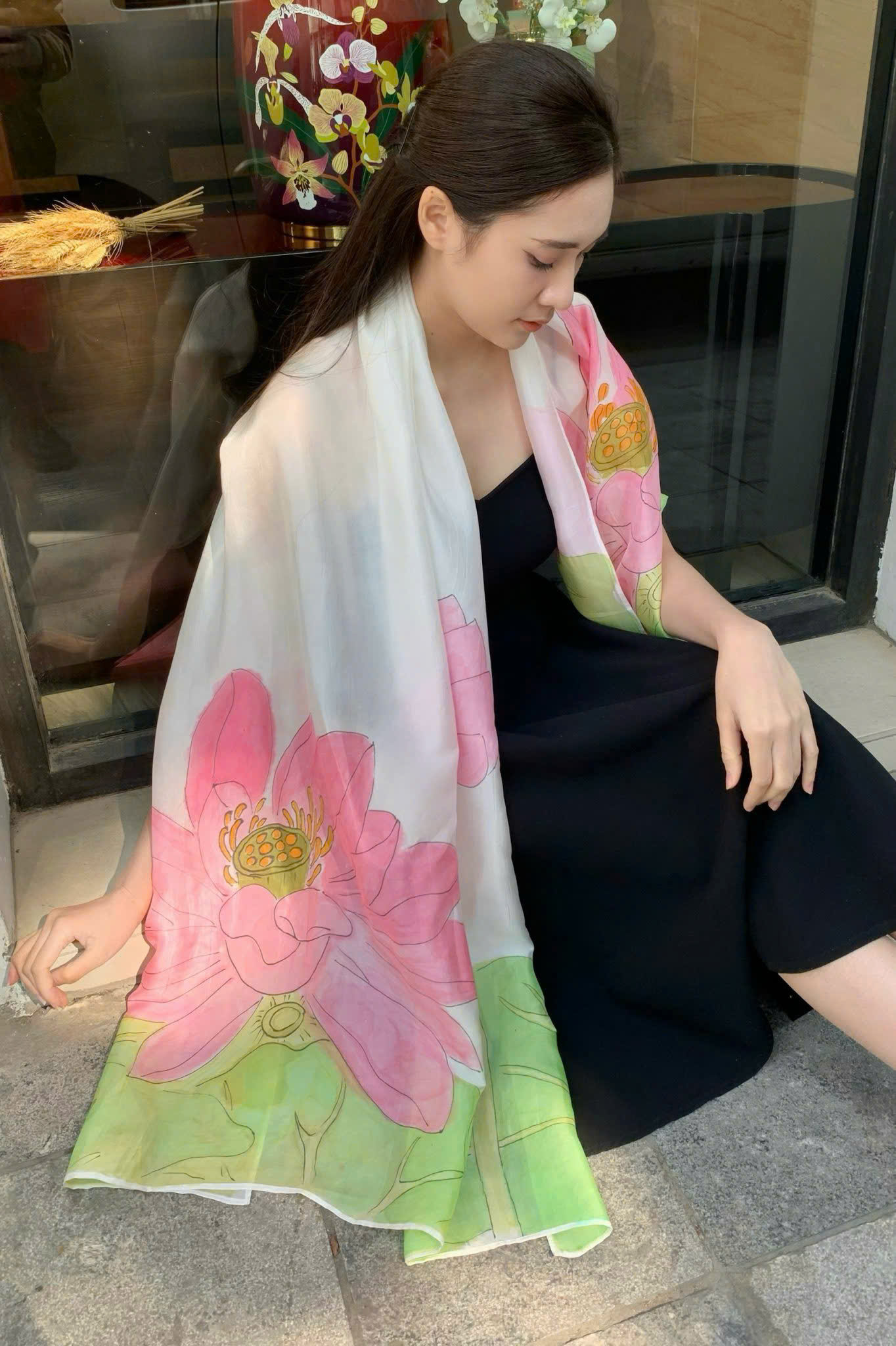 Khăn lụa tơ tằm vẽ tay hoa sen hồng nền xanh được đóng gói trong túi và hộp quà sang trọng, kèm bưu thiếp xinh xắn, sẵn sàng để trở thành món quà cao cấp mang đậm bản sắc văn hóa Việt Nam. Đây là lựa chọn lý tưởng cho doanh nghiệp khi tặng đối tác nước ngoài, hay cho những người đi công tác, du học, du lịch mang theo quà lưu niệm Việt tinh tế.