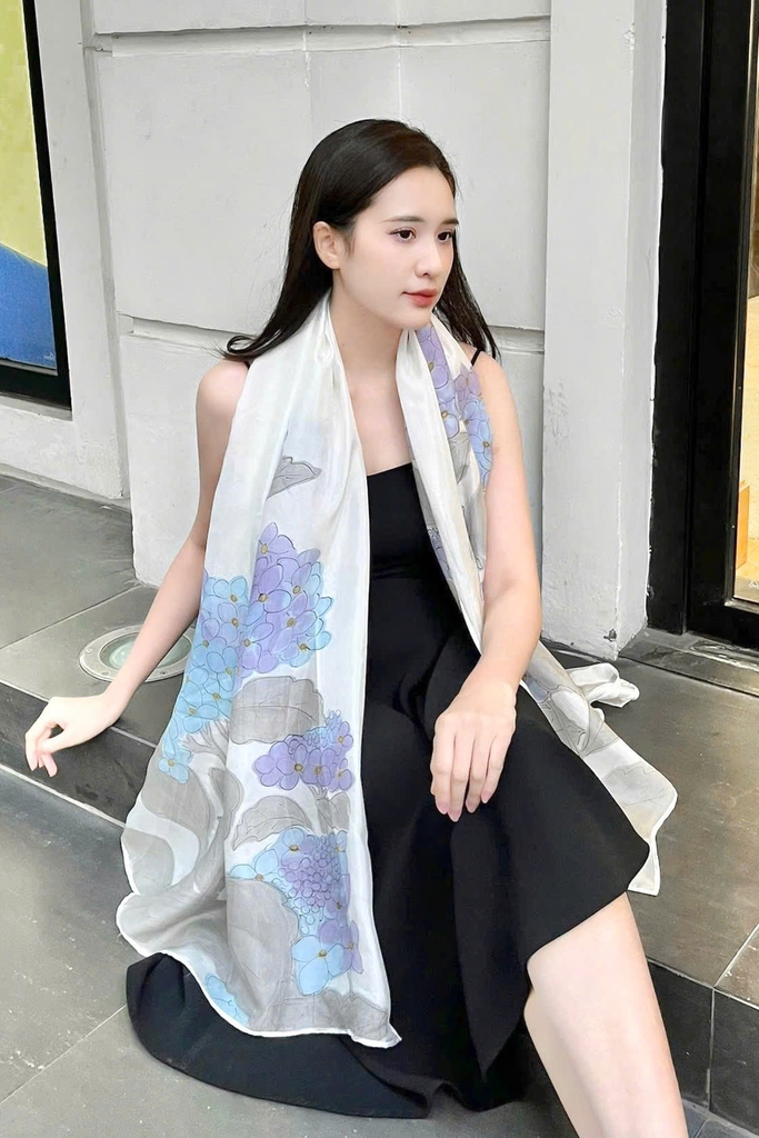 Từ lụa tơ tằm tự nhiên 100%, chiếc khăn vẽ tay hoa cẩm tú cầu của Kimcatsilk mang đến sự mềm mại, óng ả và sang trọng. Mỗi cánh hoa được tái hiện qua nét cọ thủ công tinh tế, giúp chiếc khăn trở thành một tác phẩm nghệ thuật độc bản, vừa hiện đại vừa lưu giữ hơi thở truyền thống Việt Nam.