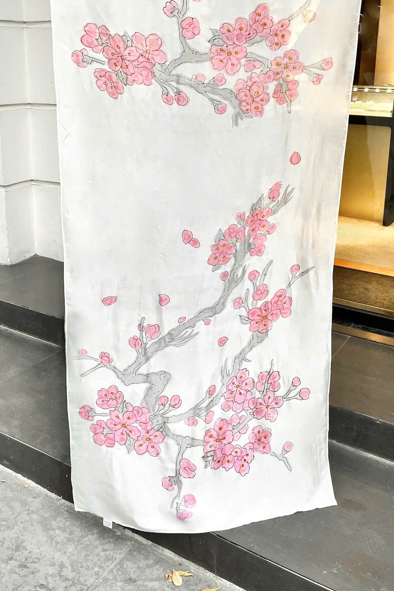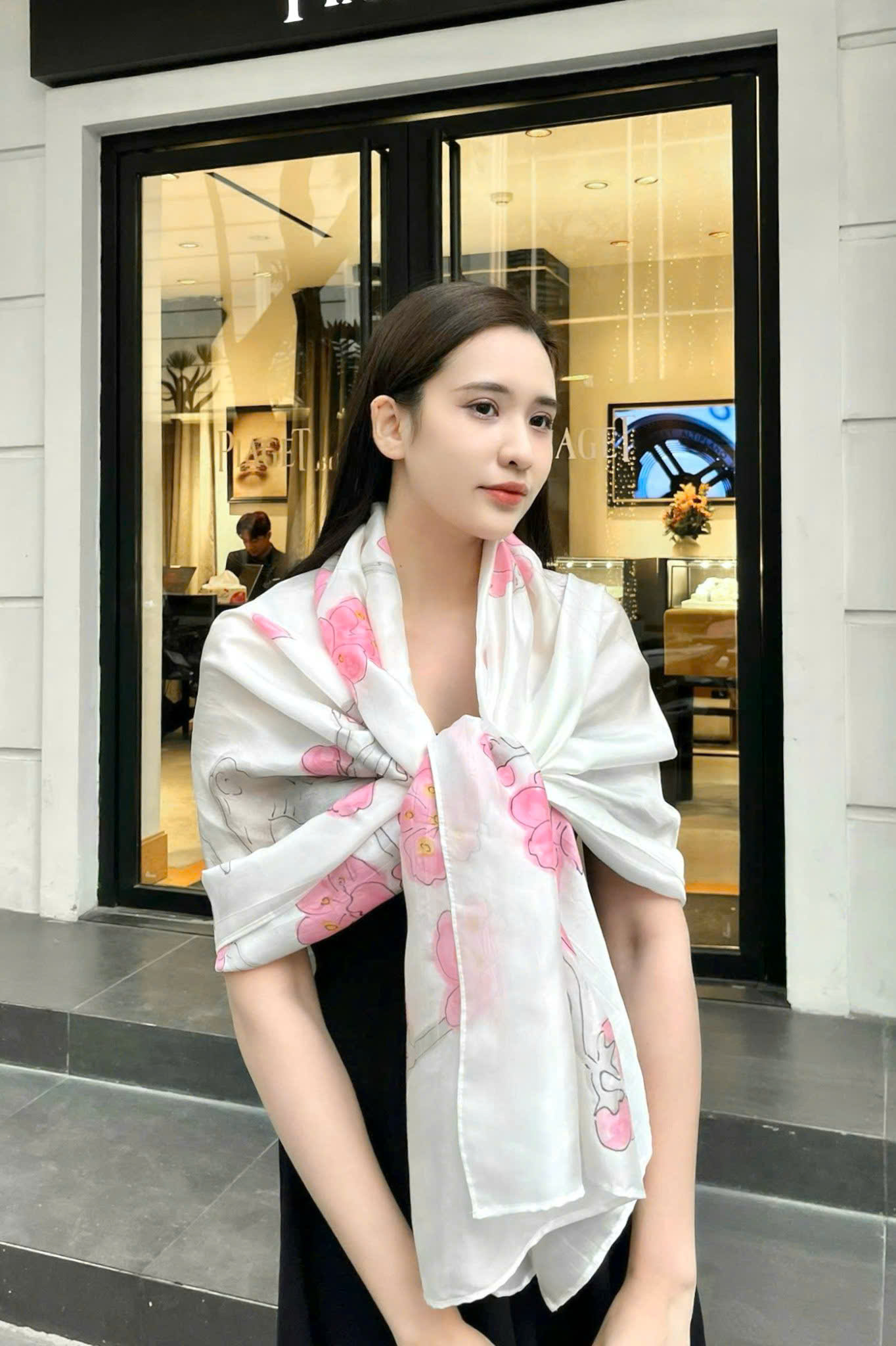 Sắc trắng, hồng và ghi thanh nhã giúp chiếc khăn lụa tơ tằm vẽ tay hoa đào trở thành phụ kiện lý tưởng để diện trong nhiều dịp: dự tiệc, đi làm, gặp gỡ đối tác hay dạo phố.