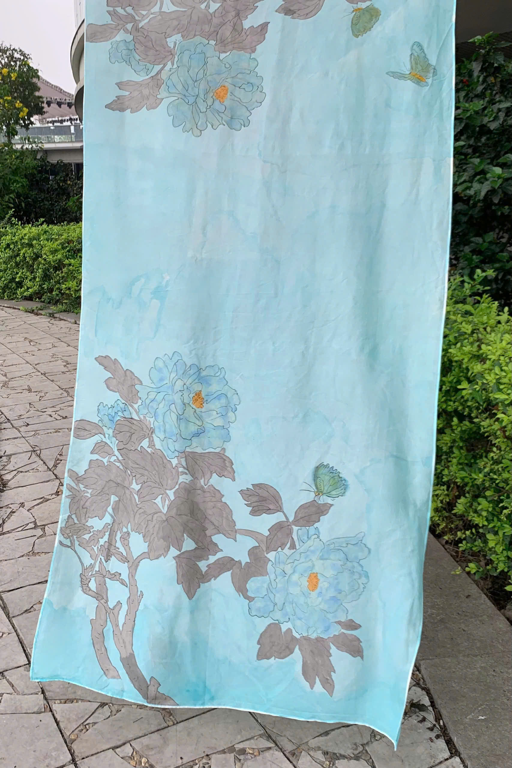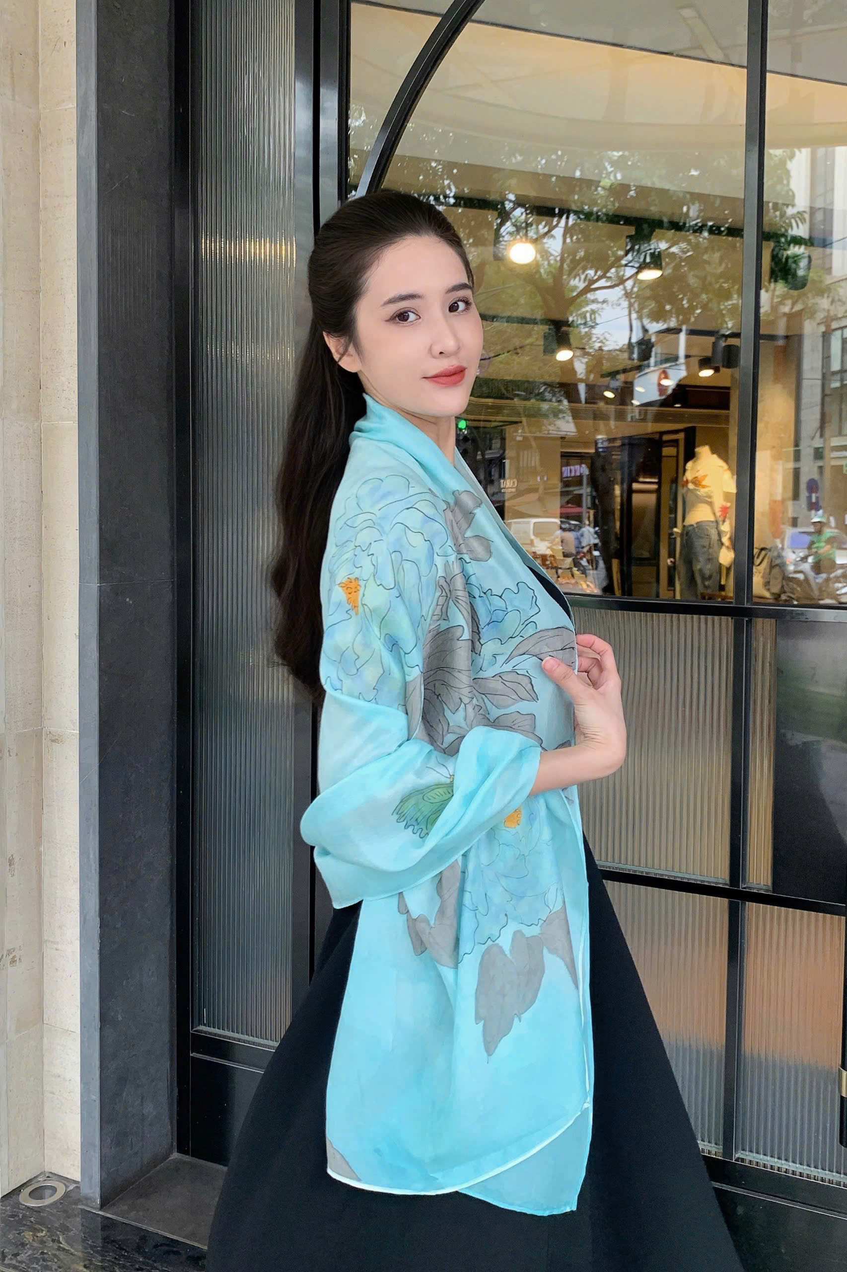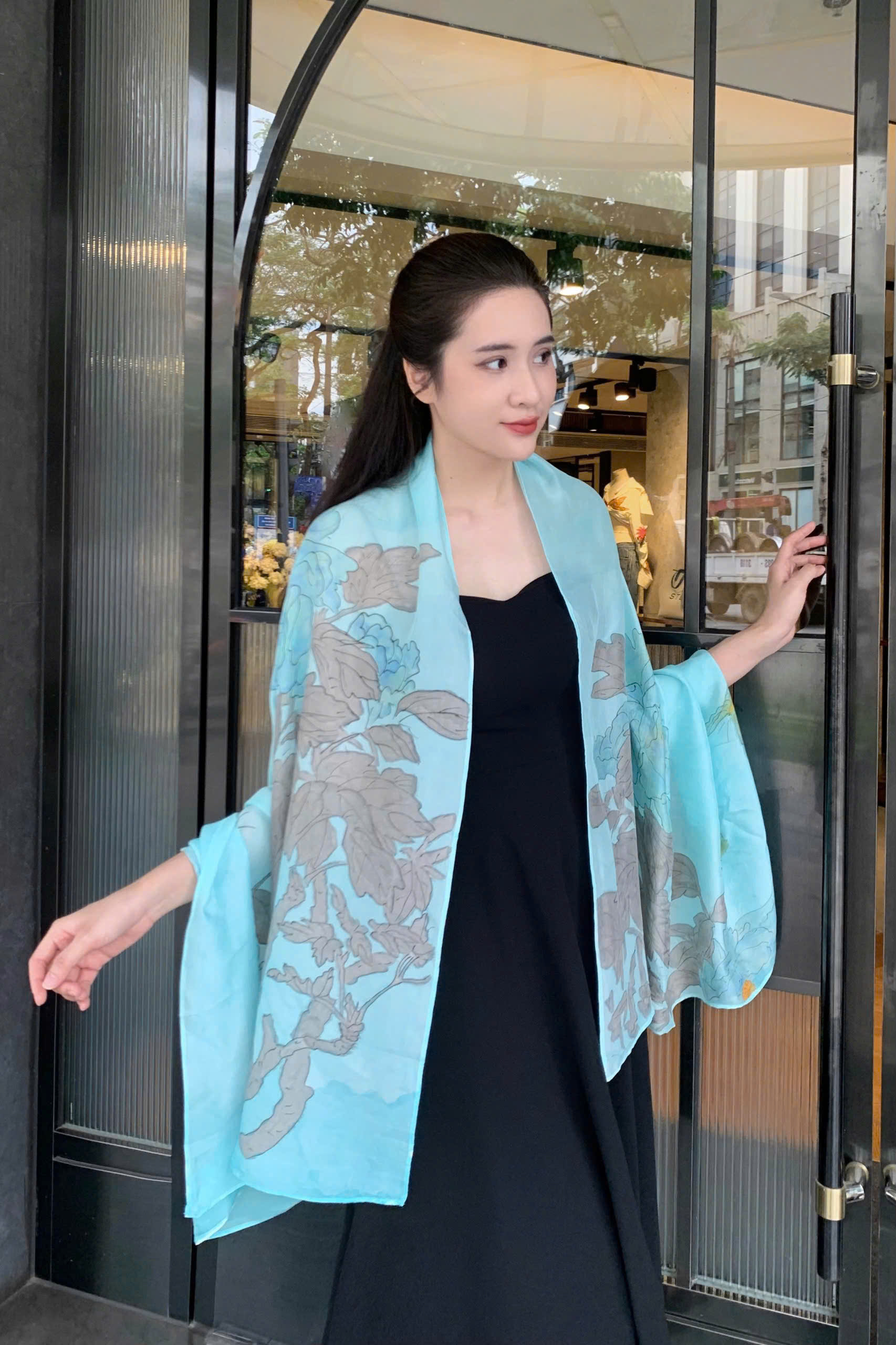 Chiếc khăn lụa tơ tằm vẽ tay hoa mẫu đơn mang đến hình ảnh của sự thịnh vượng, may mắn và vẻ đẹp quý phái. Mỗi đường cọ của nghệ nhân Kimcatsilk tái hiện bông hoa nở rộ, tràn đầy sức sống, vừa kiêu sa vừa mềm mại trên nền lụa óng ánh.