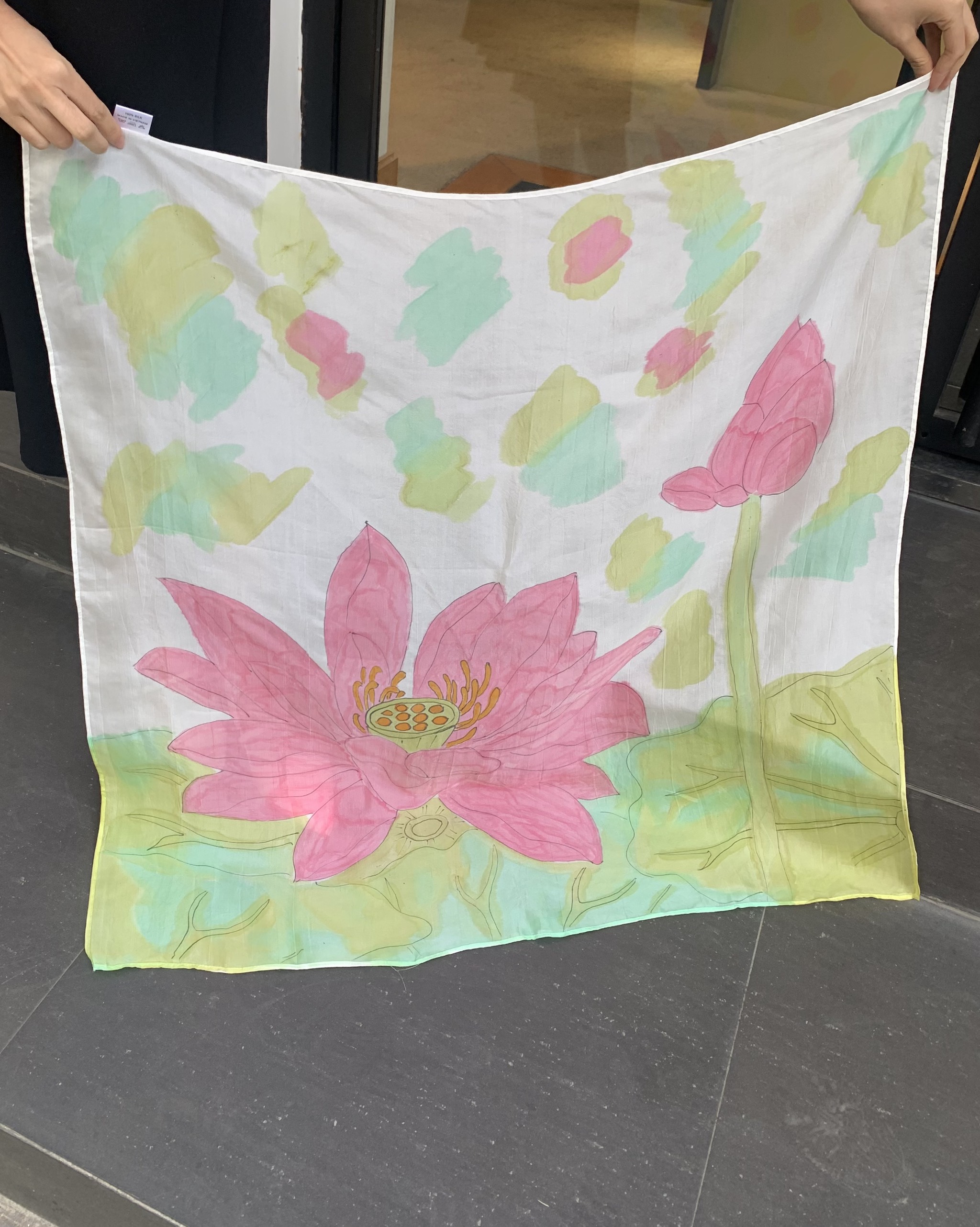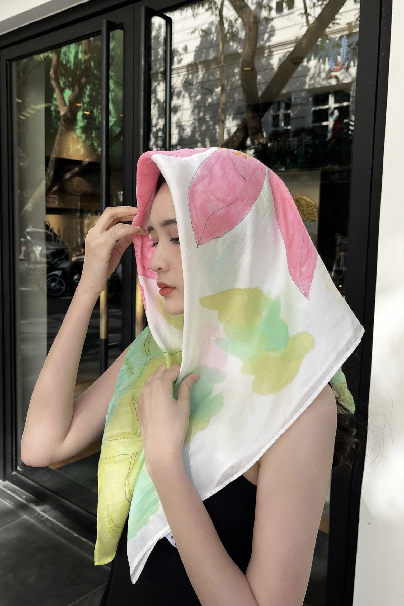Chiếc khăn được dệt từ 100% lụa tơ tằm Việt Nam tự nhiên, mang lại cảm giác mềm mại, thoáng mát và bền đẹp. Trên nền trắng tinh khôi, hình ảnh hoa sen hồng – biểu tượng của tình yêu, sự thuần khiết và lòng biết ơn – được vẽ tay tỉ mỉ bằng màu chuyên dụng cho lụa, đảm bảo không phai và an toàn cho người sử dụng.