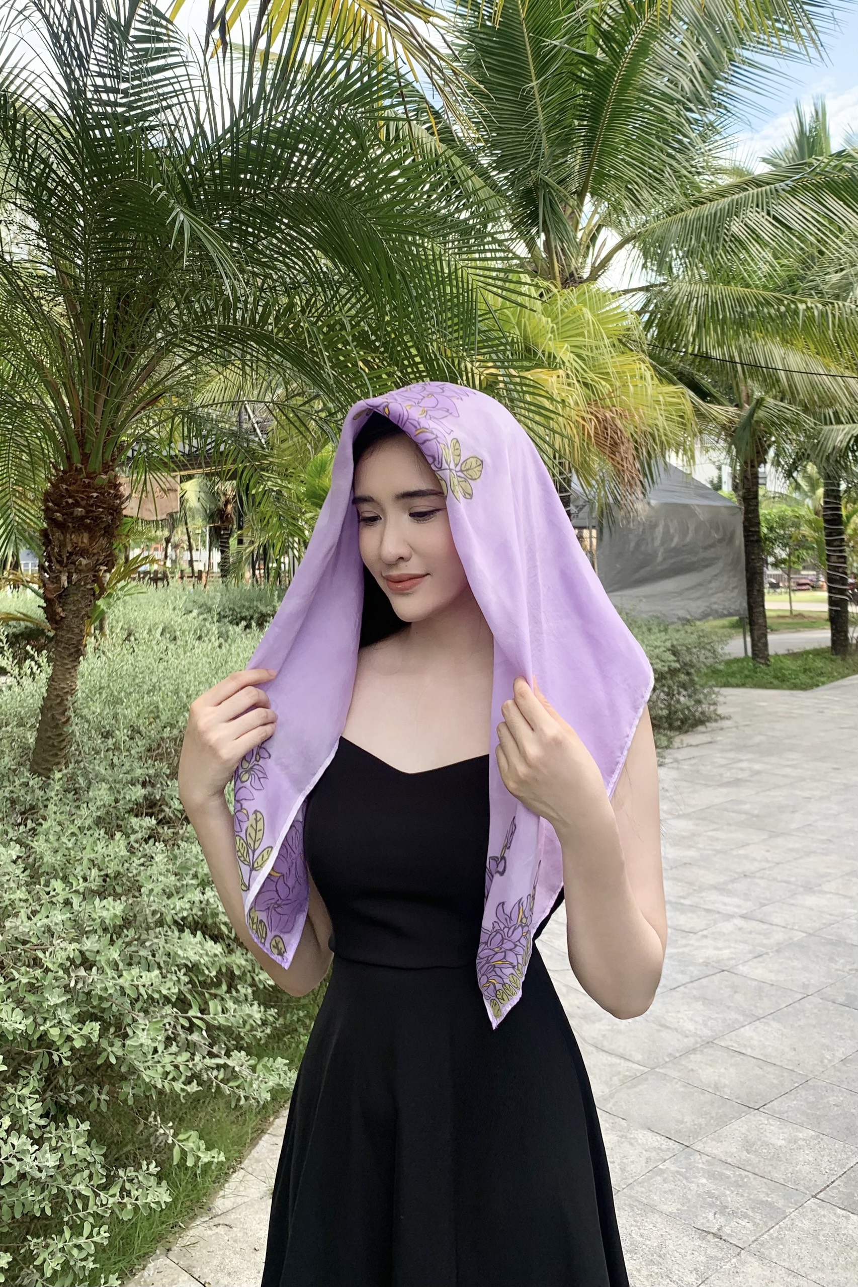 Khăn lụa tơ tằm vẽ tay vuông luôn là món phụ kiện tinh tế, tôn lên vẻ đẹp thanh lịch và sang trọng của người sử dụng. Mẫu khăn lụa vẽ hoa tử đằng tím của Kimcatsilk được chế tác từ 100% tơ tằm Việt Nam tự nhiên, mang đến sự mềm mại, thoáng mát và bền đẹp theo thời gian.